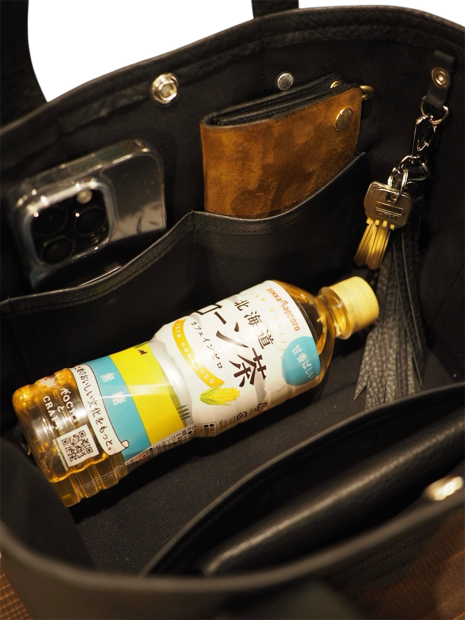 内ポケット2つと500mmペットボトルが横にして2本入る容量です。